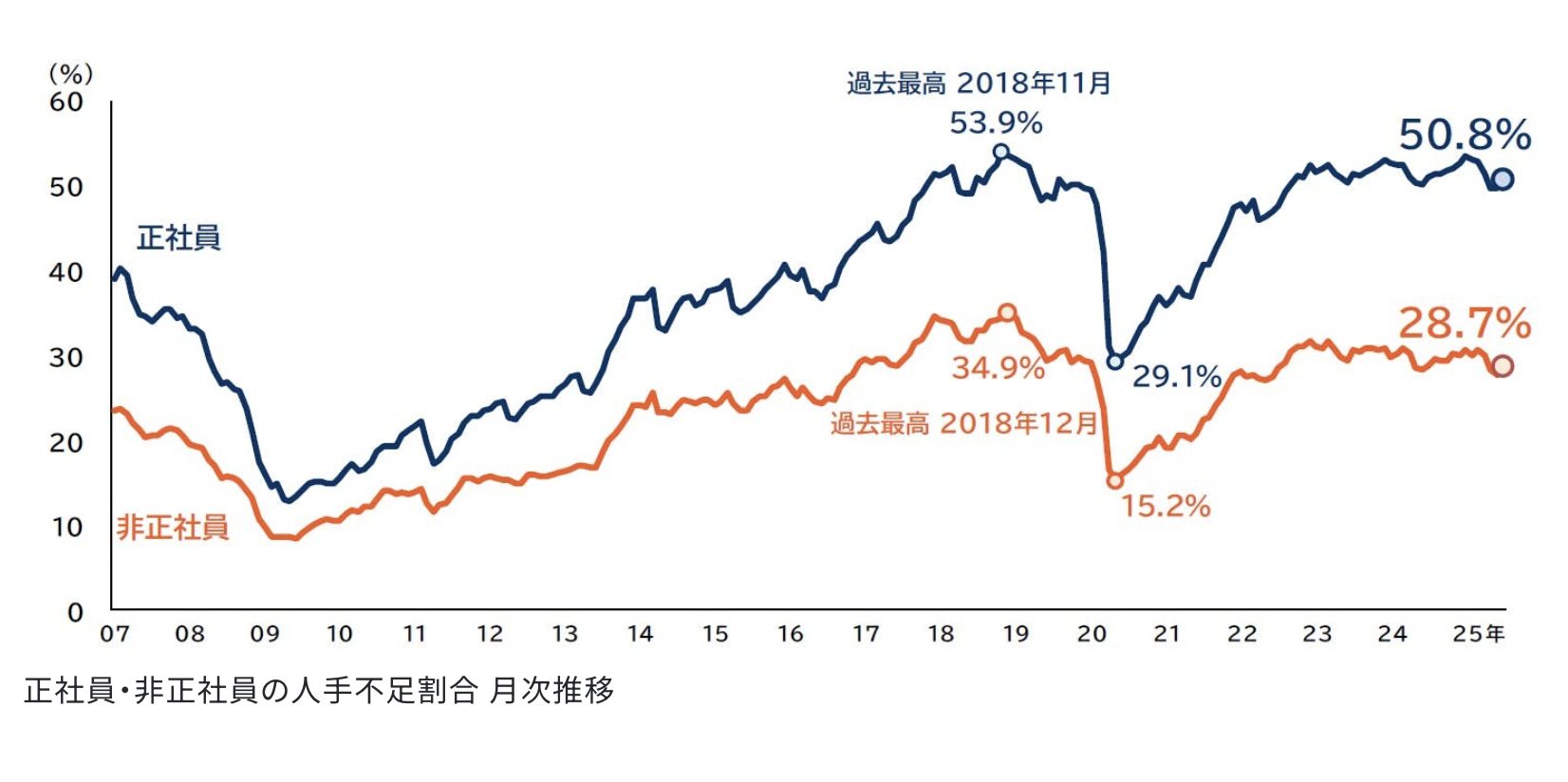 帝国データバンクの調査(2025年7月)によると、2025年の正社員不足は50.8%、非正社員不足も28.7%。