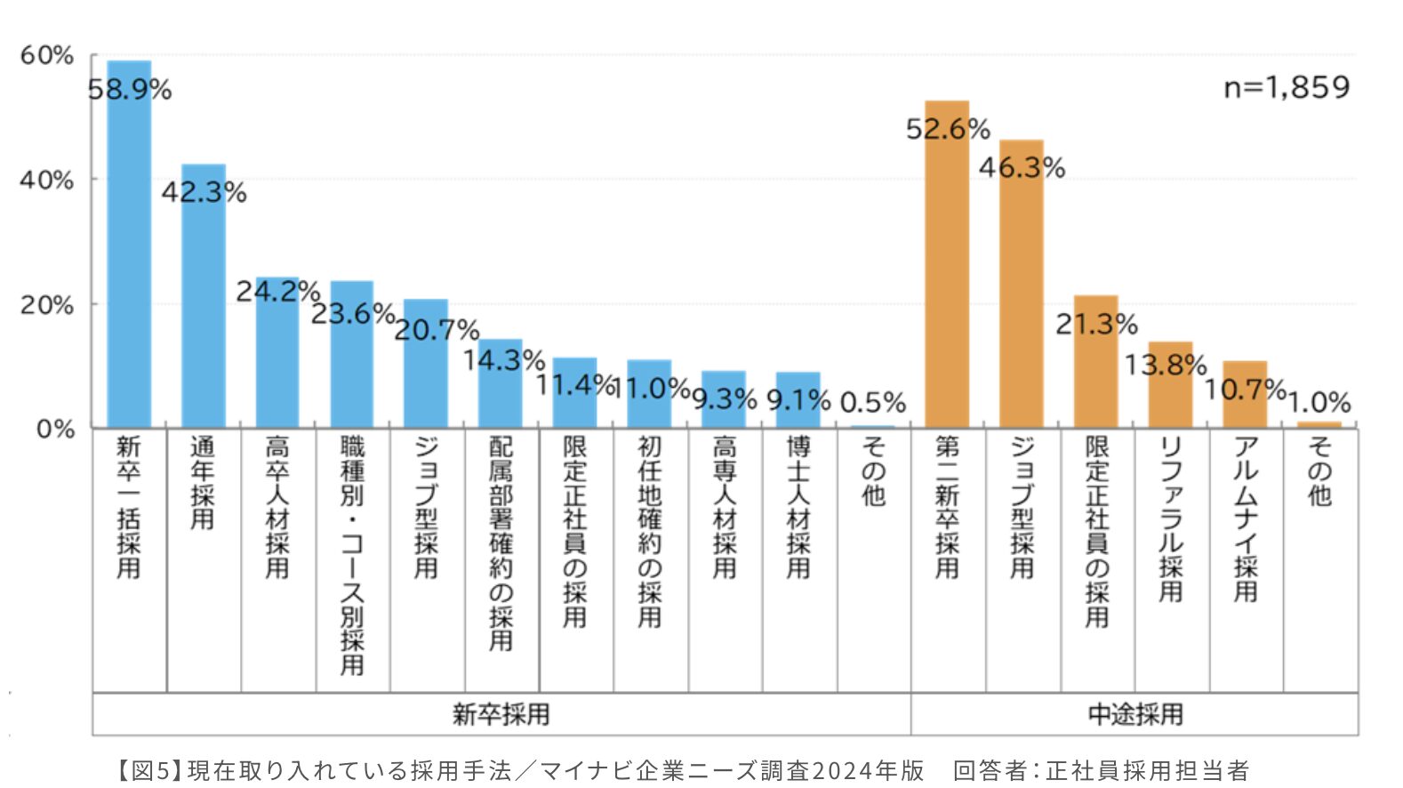 このグラフを見てみると、オレンジの棒グラフが中途採用(=転職)にあたりますが、第二新卒採用を取り入れている割合がもっとも多いですね。ということは、第二新卒は転職のボーナス期間とも言えそうです。